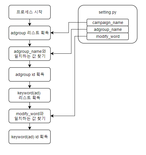 - 해당 id값 획득을 위해서는 adgroup id의 값을 얻어, 해당 값으로 keyword 또는 ad의 리스트를 획득하고, 그 중 금액 변경을 희망하는 ad id 또는 keyword id 값을 찾아야합니다.