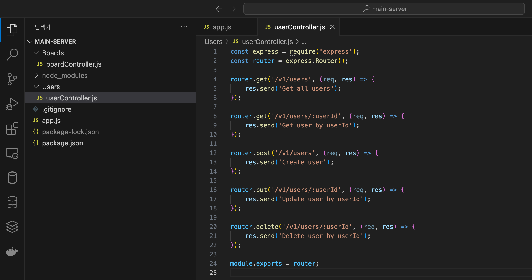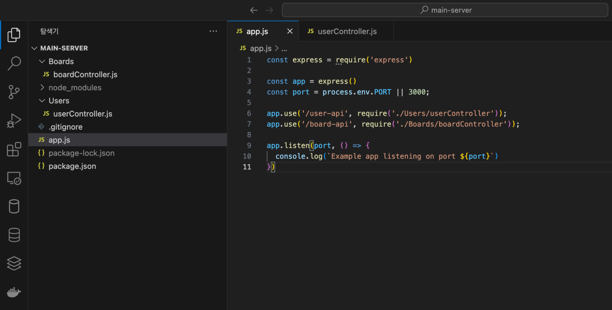 - 그리고 app.js를 아래와 같이 수정했습니다.