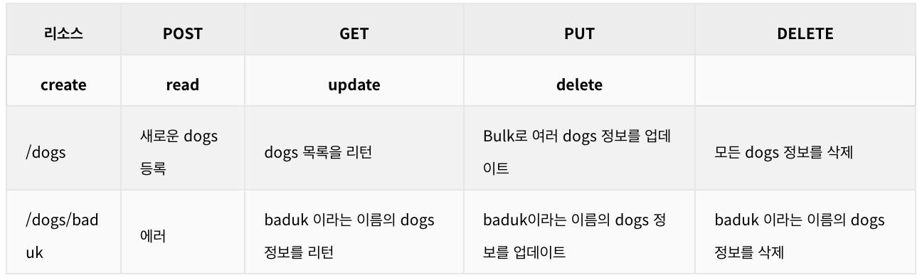 - RESTfulAPI에서 사용하고 있는 4개의 매서드 GET, POST, PUT(PATCH), DELETE를 각각 Read, Create, Update, Delete와 매칭하여 동작하게끔 디자인합니다.